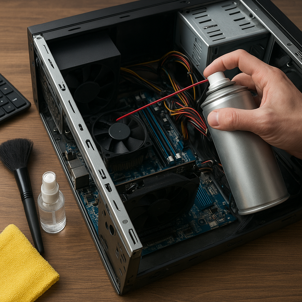 - Nigdy nie skieruj sprężonego powietrza zbyt blisko delikatnych elementów — strumień może odkształcić wentylator lub chipset.